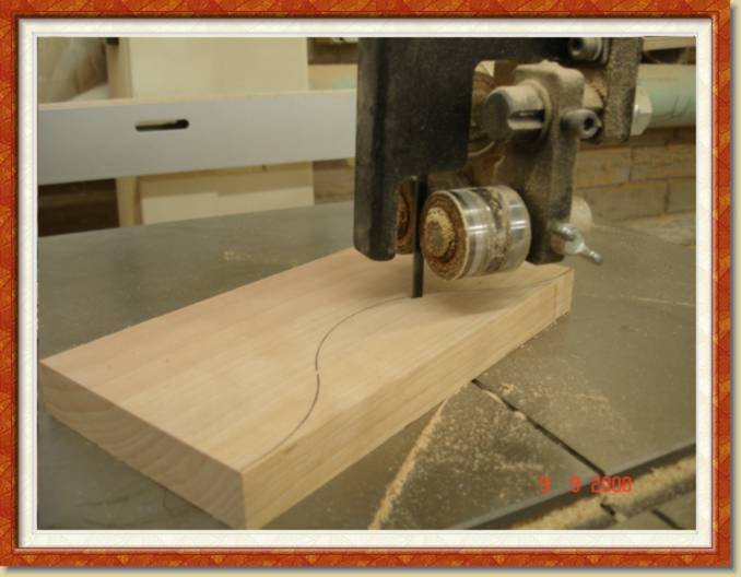 A top rail for a cathedral door is cut with a band saw ![]() |